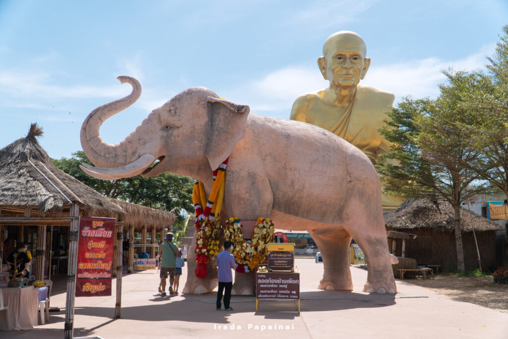 บริเวณโดยรอบองค์หลวงปู่ทวดจัดสวนตกแต่งไว้อย่างสวยงาม และยังมีรูปปั้นช้างเผือกคู่บารมีหลวงพ่อทวด 2 เชือก โดยช้างที่อยู่ด้านซ้ายเป็นช้างเผือกเพศผู้ นักท่องเที่ยวสามารถลอดท้องช้างเพื่อความเป็นสิริมงคลได้ โดยเชื่อกันว่าจะช่วยเสริมบุญบารมี สุขภาพแข็งแรง และเจริญก้าวหน้าในหน้าที่การงาน ส่วนช้างที่อยู่ด้านขวาเป็นช้างเผือกเพศเมีย เชื่อกันว่าหากเดินลอดท้องช้างเพศเมียอีกครั้งจะช่วยเสริมบารมี เงินทองไหลมาเทมา และสุขสมหวังในทุกสิ่ง
